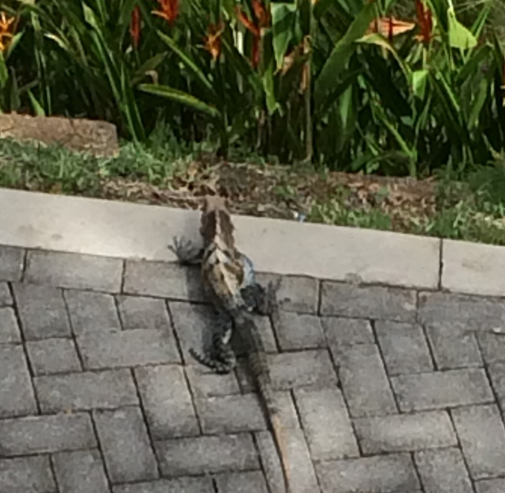 He pretty much looked like an Iguana – the usual spines and splotches, with a funny splotch in the middle of his back, right next to the row of spines. All four legs were a bright color of blue. I’m sure I’d recognize him if I saw him again.