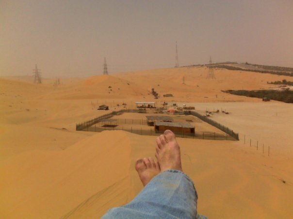 This is atop a scalding hot dune … somewhere near Liwa Oasis, at the edge of the empty quarter separating the UAE and Saudi Arabia. On the drive there, the road often disappears as sand swirls across it. Date farms, the occasional camel farm and oil fields dot the otherwise desolate landscape. I stopped at a date farm, where the owner caught me driving on to the property. I’ll admit to being a little nervous when he approached my car. The purpose? He and his wife invited me in for tea.
