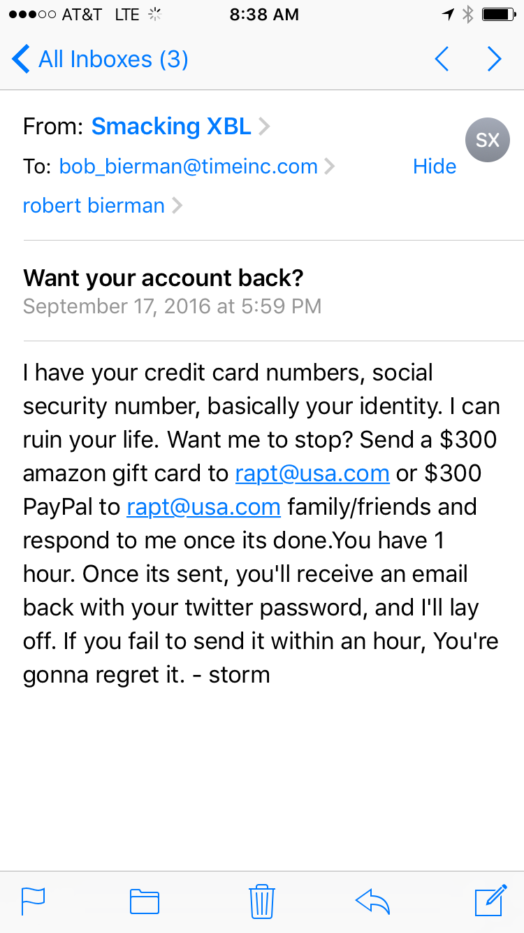 Granted, I did not enjoy getting an email from “Smacking XBL”, discovering my Twitter account had been hacked, the email deleted, cell phone deleted and password changed. Nor did I enjoy the four days of getting it sorted out while wondering what information the hacker had harvested from the dark recesses of my account. But that wasn’t what caused me to dislike Twitter and me.
